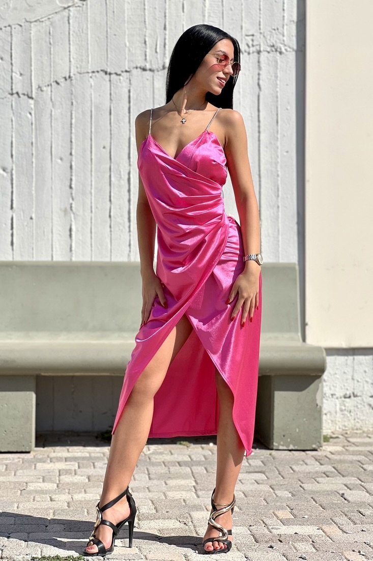 Μίντι σατέν φόρεμα με κόψιμο. Διαθέτει ενίσχυση στο στήθος και τιράντες από στρας.