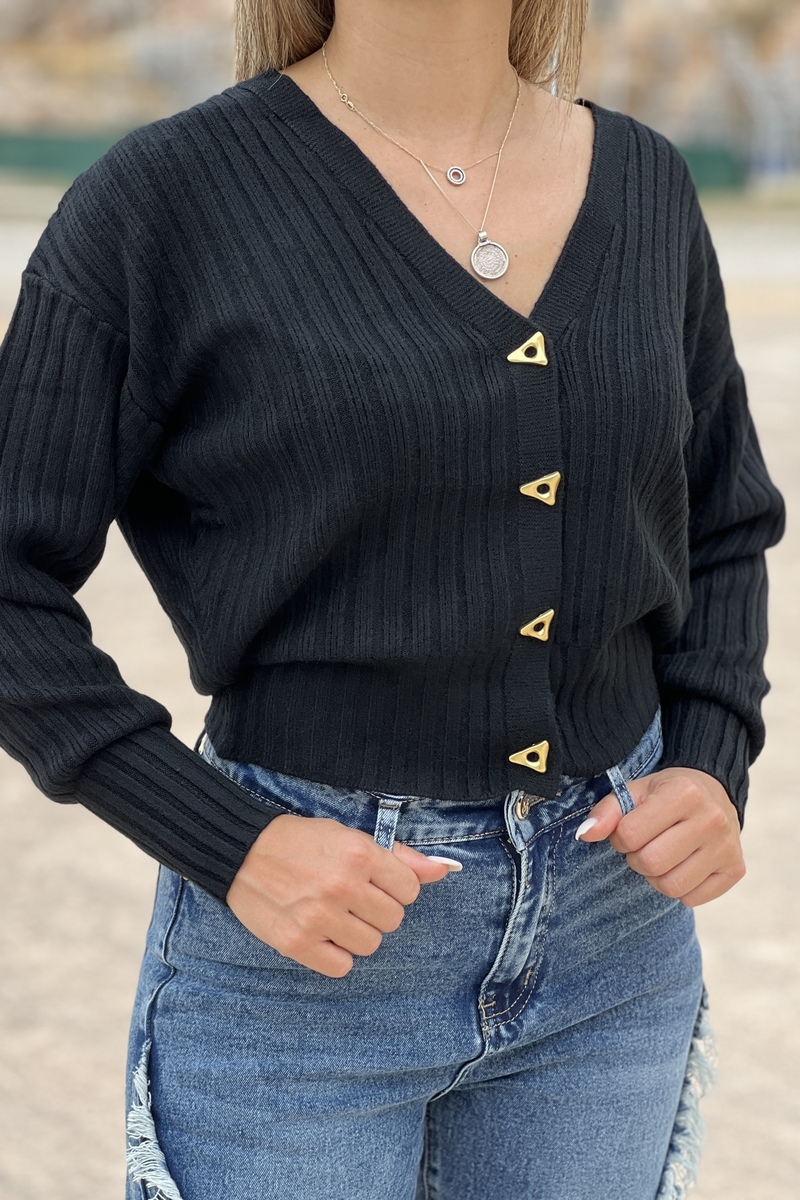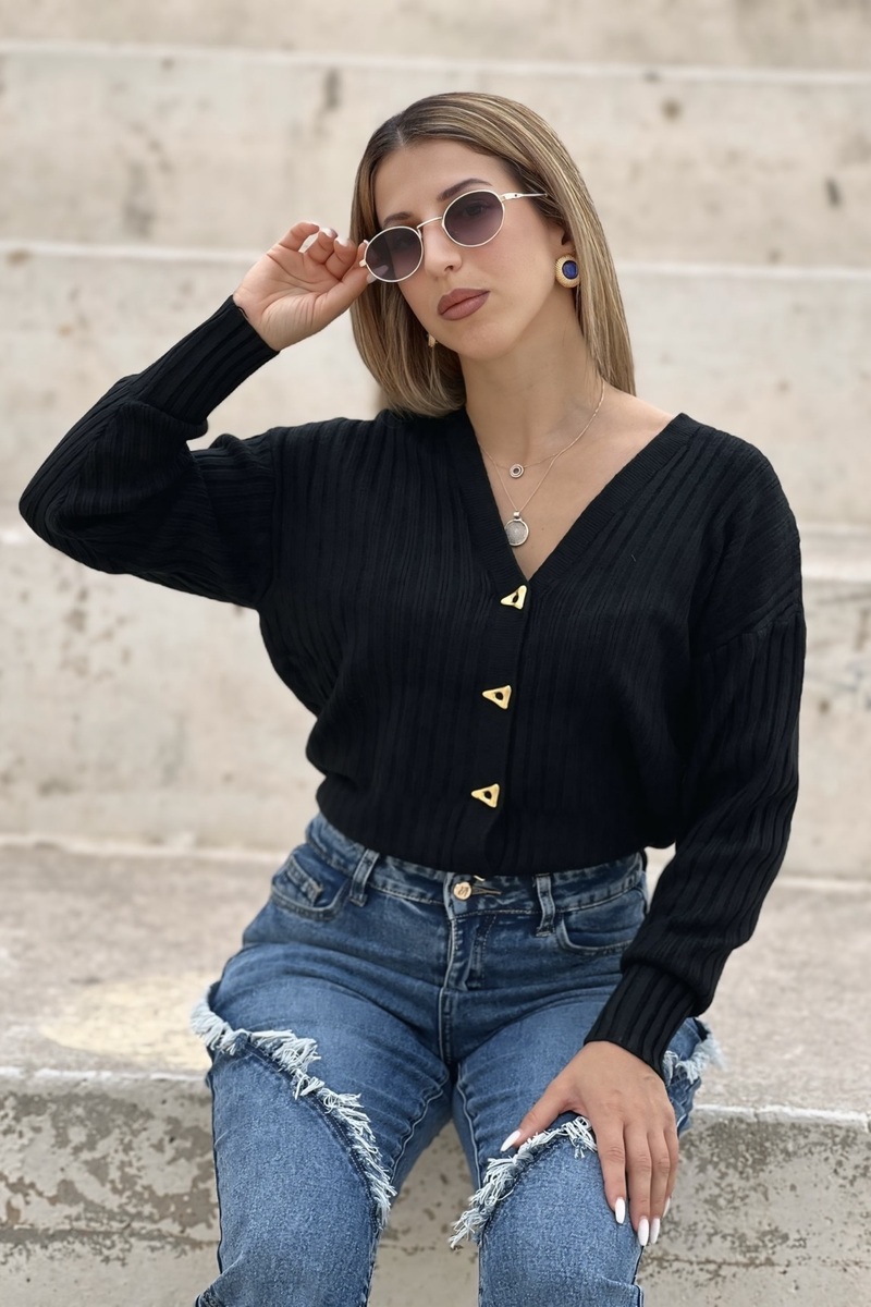Ζακέτα με πλεκτό ελαστικό ύφασμα σε μαύρο χρώμα με πολύ μαλακή υφή. Κλείνει με χρυσά κουμπιά στο μπροστινό μέρος.