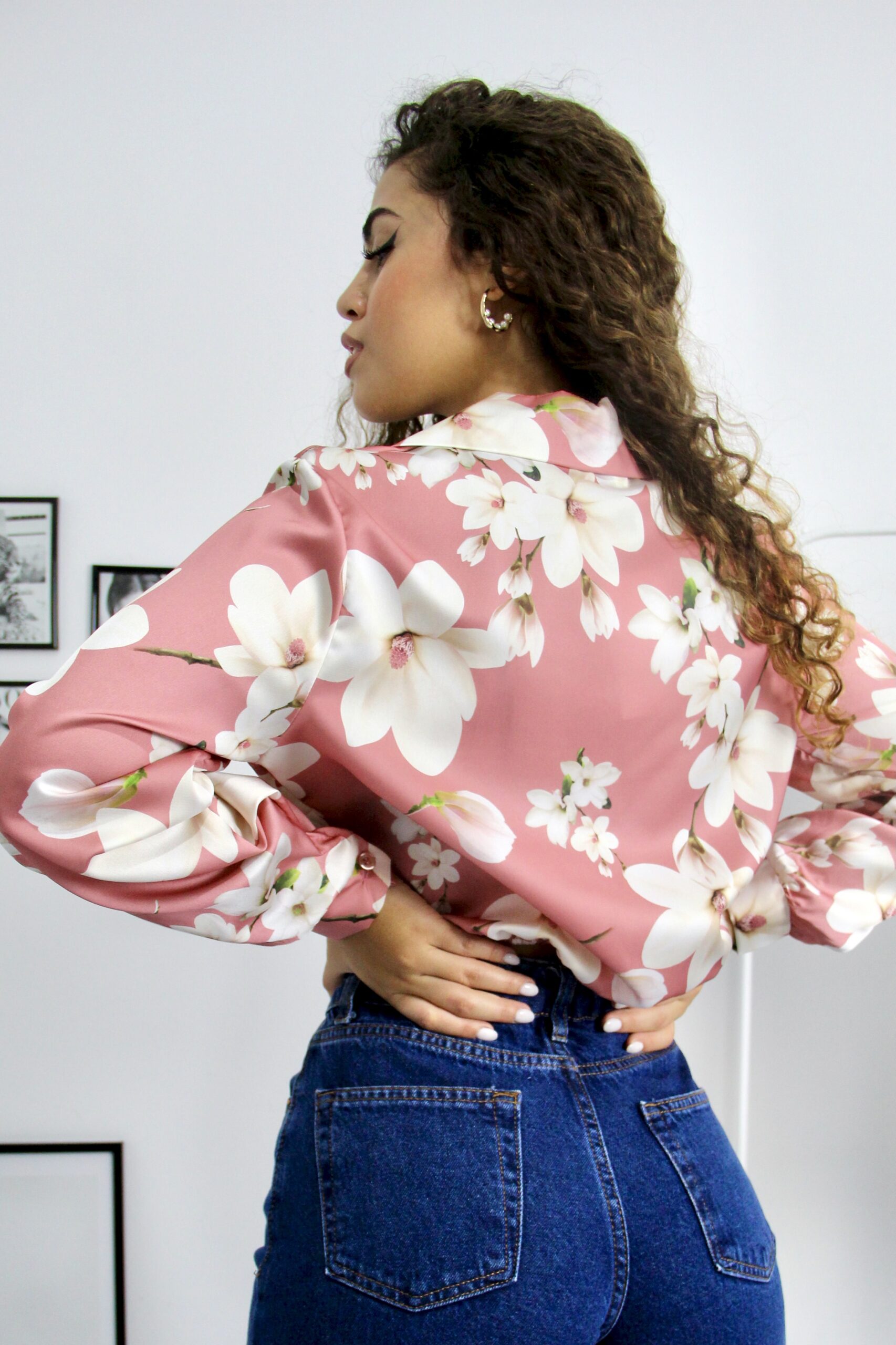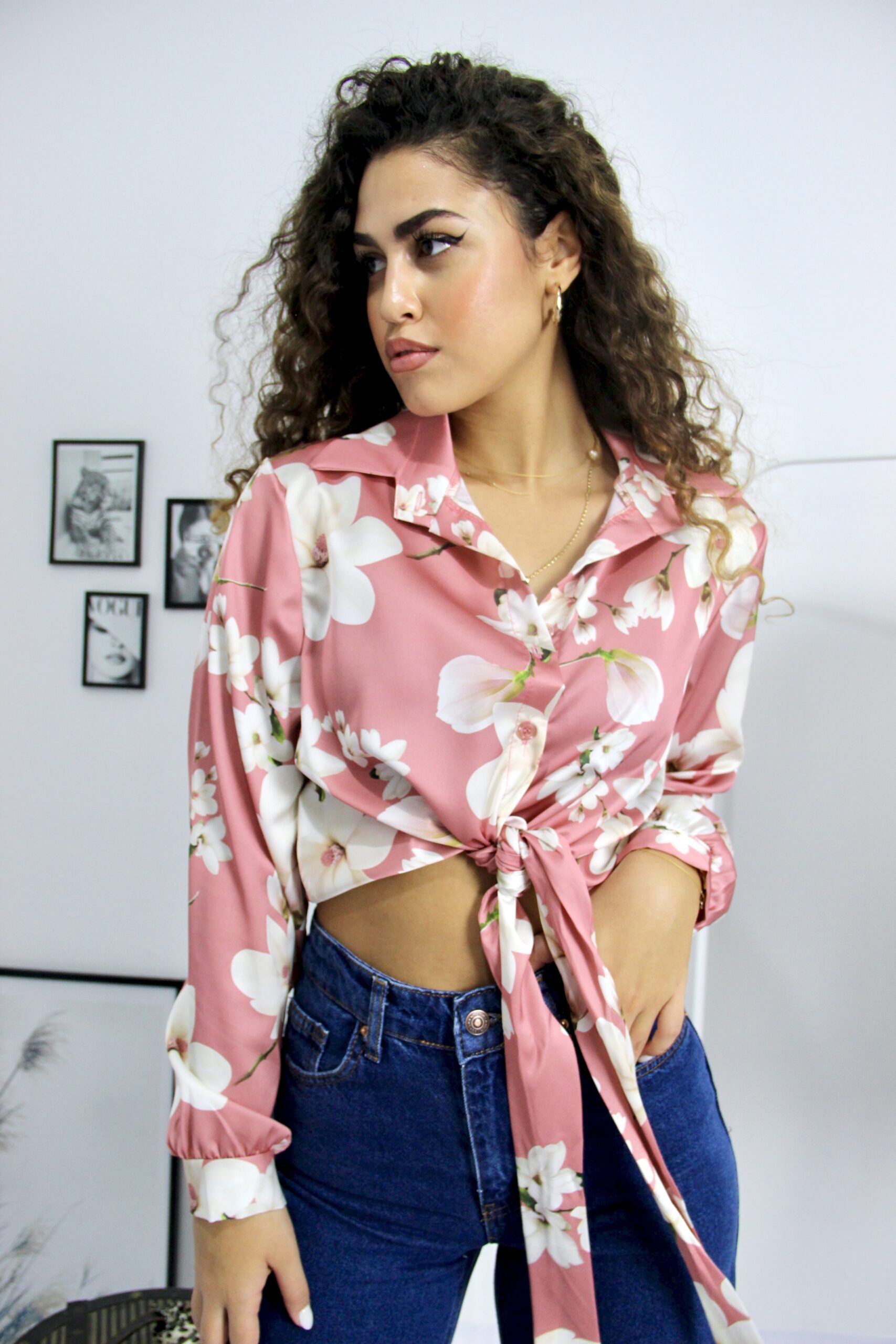 Σατέν κοντό πουκάμισο με φλοράλ print που δένει στη μέση και κλείνει με κουμπιά. Διαθέτει λάστιχο περιμετρικά στο τελείωμα του.