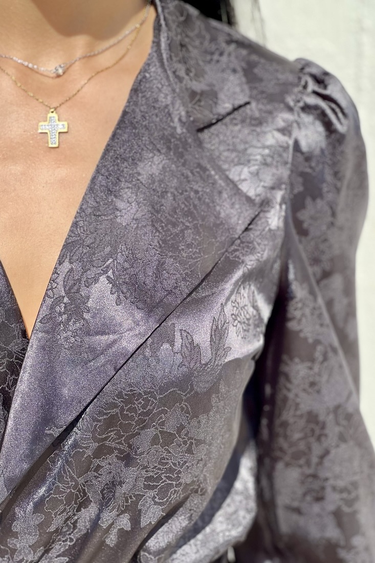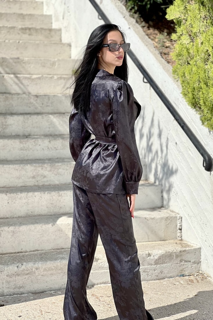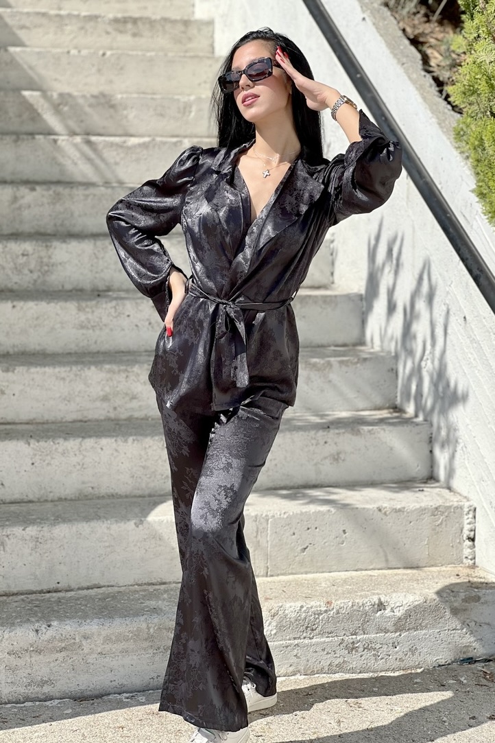 Σατέν σετ παντελόνι και κιμονό. Το κιμονό διαθέτει ζωνάκι και το παντελόνι έχει λάστιχο στη μέση. Με σατέν φλοράλ σχέδιο.