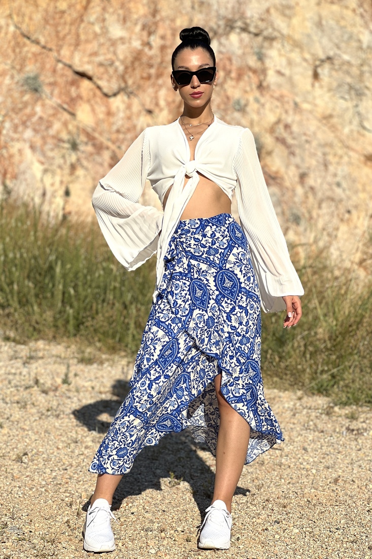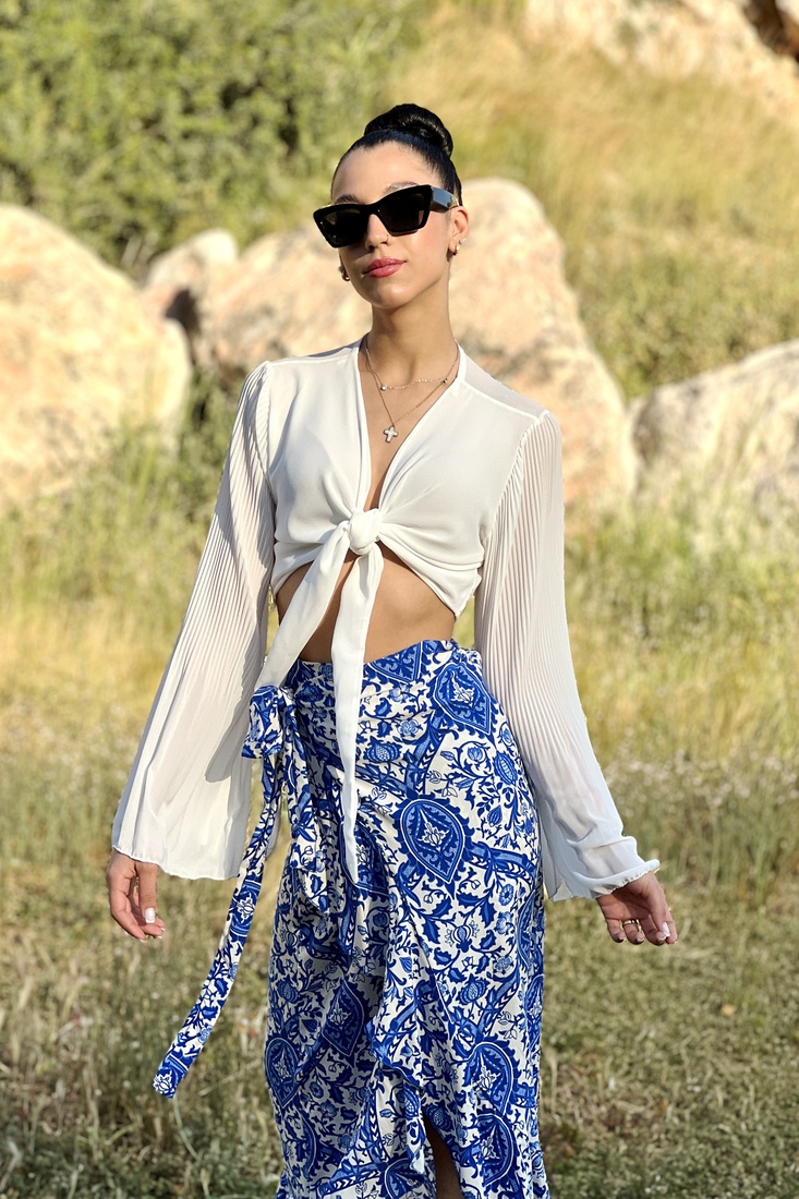 Τοπ με φαρδιά πλισέ μανίκια. Δένει στο στήθος.