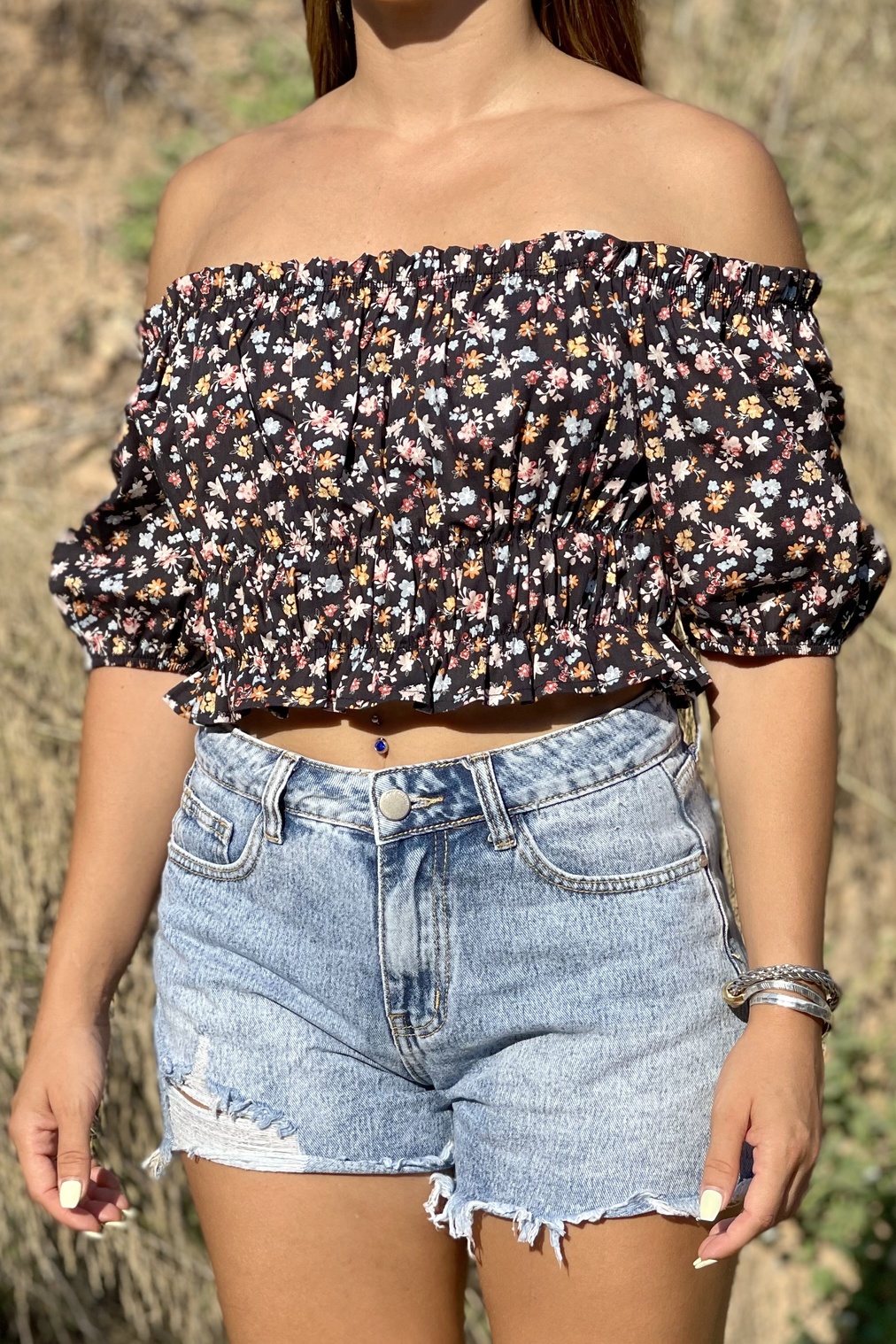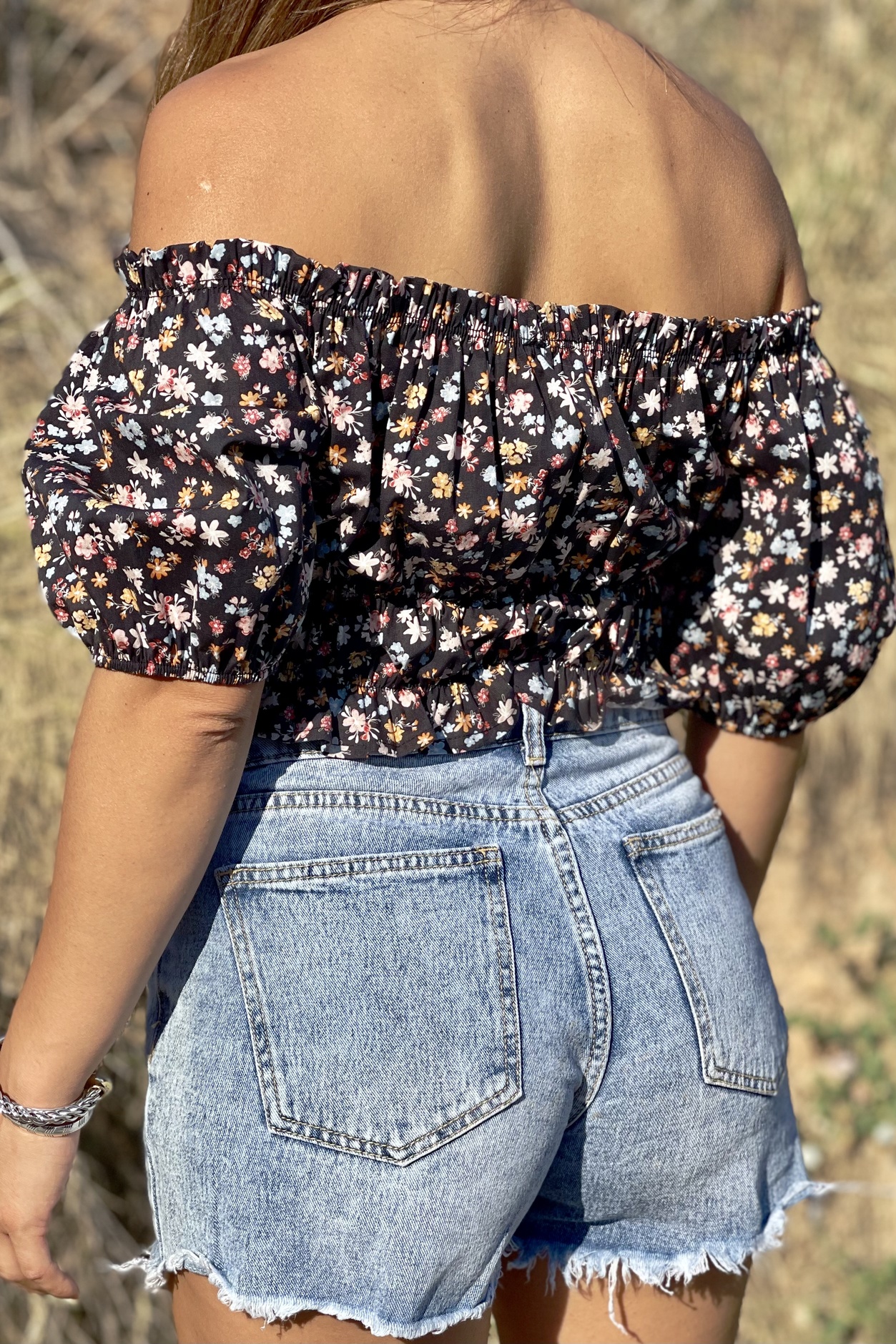 Crop top με έξω ώμους και floral print. Διαθέτει λάστιχο περιμετρικά στα τελειώματα του.